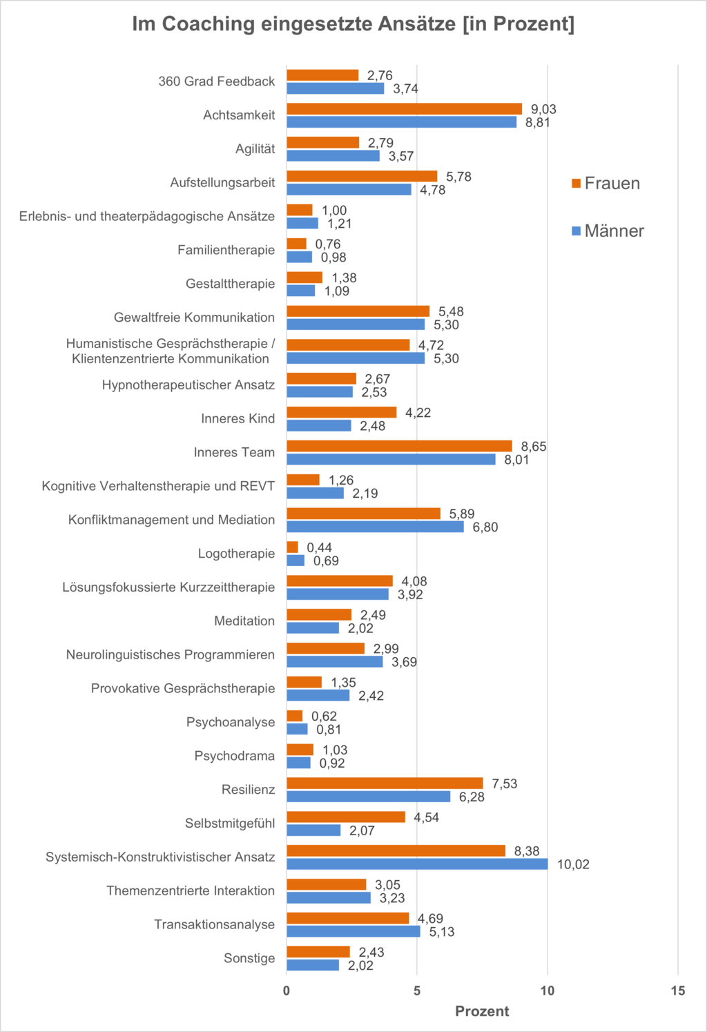 Studien belegen die Bedeutung der Methodenvielfalt: Die RAUEN Coaching-Marktanalyse 2024 zeigt, dass Coaches vorwiegend einen Ansatz-Mix nutzen. Die Analyse differenziert nach Ansätzen, Methoden und Testverfahren und vergleicht u.a. geschlechtsspezifische Muster. Häufig genannte Schwerpunkte sind der systemisch-konstruktivistische Ansatz, Achtsamkeit, Inneres Team, Resilienz sowie Konfliktmanagement und Mediation (vgl. Abb.). Ebenfalls präsent sind gewaltfreie Kommunikation, Transaktionsanalyse, lösungsfokussierte Kurzzeittherapie, humanistische Gesprächsführung und kognitive Verfahren inkl. REVT. Die Häufigkeit ist zudem genderdifferenziert verteilt (z.B. höherer Anteil systemisch-konstruktivistischer Ansatz bei Männern (Männer: 10 Prozent, Frauen: 8,4 Prozent); stärkerer Fokus auf Selbstmitgefühl bei Frauen (Frauen: 4,5 Prozent; Männer: 2,1 Prozent).